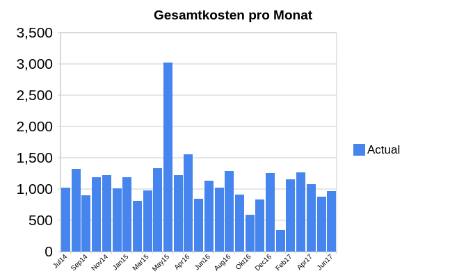In dieser Graphik sieht man unsere gesamten Ausgaben pro Monat. Unserem selbst gesetztes Budget von etwa 1000 Euro kommt bisher so ziemlich hin. Genauere Aufschlüsselungen unsere Kosten pro Jahr gibts weiter unten. p>