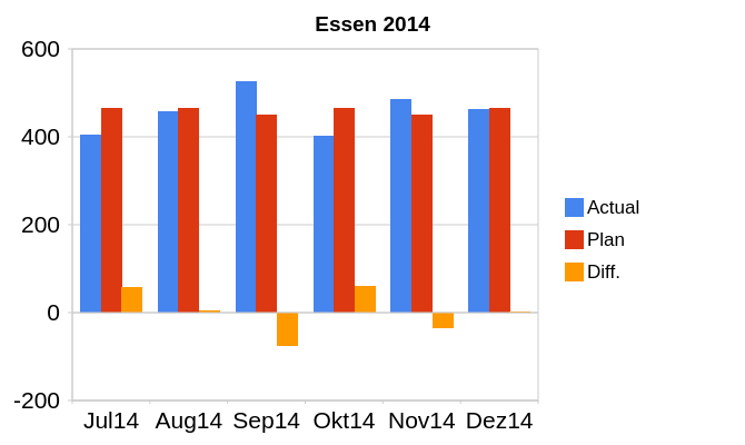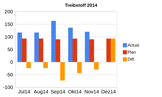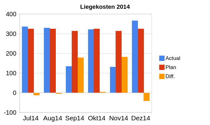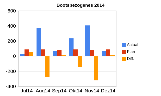 Hier sind die Kosten für die Liegegebühren in den Marinas oder die Gebühren beim Ankern abgebildet. (~10 EUR/Tag) Es ist natürlich besonders schön zu sehen, dass wir hier sparen. Ist auch verständlich, denn ankern in einer schönen, einsamen Bucht ist natürlich jeder Marina zu bevorzugen! Für das Jahr 2015 ist die Planvorgabe verringert worden.