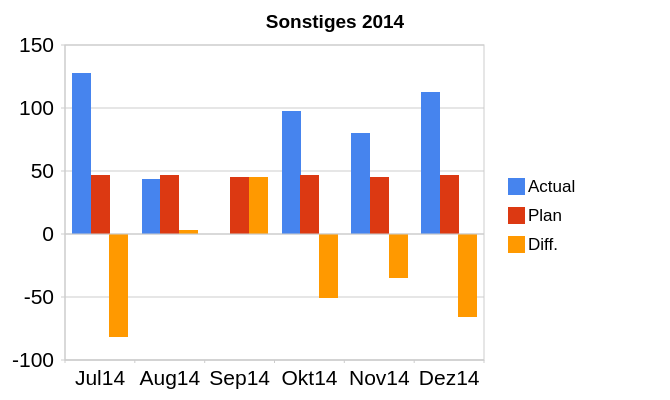 Die beliebte Kategorie "Sonstiges". Besonders das Wäsche waschen und das Telefonieren machen einen Großteil dieser Ausgaben aus. Aber auch die Kosten von neuen Büchern, Kleidung, Auto mieten und sonstigen "kleineren" Posten werden hier eingetragen. Für das Jahr 2015 wird mehr Budget in dieser Sparte eingeplant!