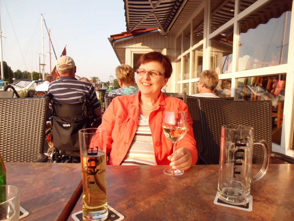 Regina genießt Sonne, Wein und Fischbuffet
