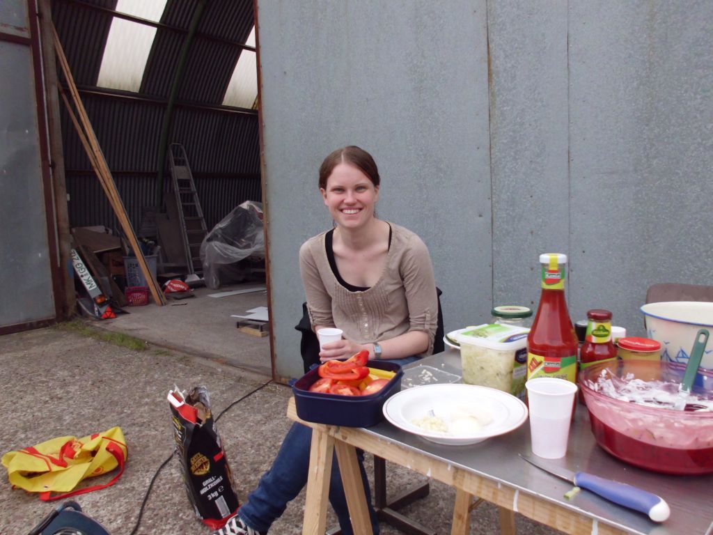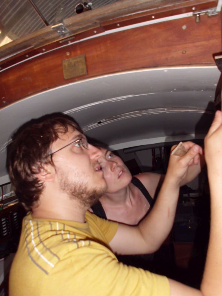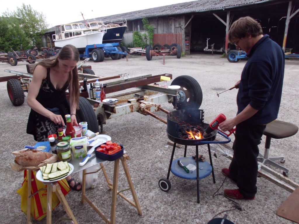 Am Tag darauf bekommen wir schon die nächsten Gäste: Mein Bruder Ma ist schnell mal wieder die 1100 km von Wien nach Varel gefahren und hat diesmal seine Freundin Vicky und unseren Bruder Martin mitgebracht. Die drei besichtigen wenig und arbeiten viel, für uns eine große Hilfe. Ma verlegt die letzten Kabel der Elektrik (und beschriftet sie übrigens vorbildlich), Martin sägt die ersten Zierleisten zurecht und Vicky streicht die letzten verbliebenen Teile der Holzdecke. Abends grillen wir mal im Werfthof, mal mit Segelkollegen beim Kran, und natürlich essen wir auch fleißig Fisch (danke M+W!).