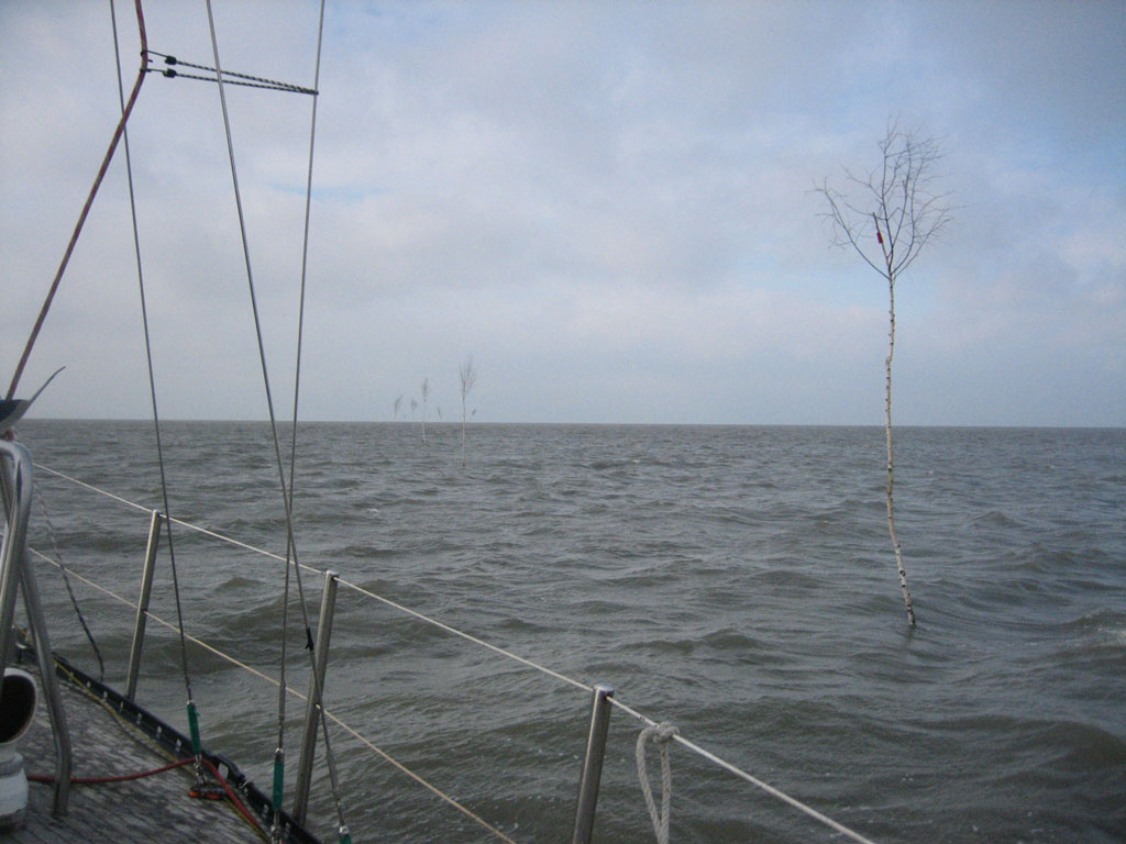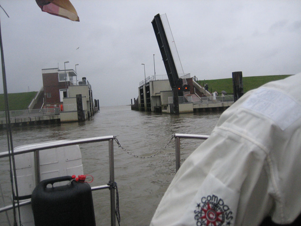 Tag zwei des Überstellungstörns: Heute haben wir nur die relativ kurze Strecke durch den Jadebusen nach Varel vor uns, allerdings wieder entlang eines trockenfallenden Prickenweges, das heißt der Abfahrtszeitpunkt will genau geplant sein. Diesmal sind wir natürlich etwas zu früh dran und laufen bald auf Grund. Kein Problem, einfach zurück zum Beginn des Weges, dort ankern und auf die Flut warten. Doch diesmal ist die Strömung sehr stark, der Anker erreicht nicht mal den Boden, bevor er so weit abgetrieben wird, dass wir Angst haben, die Ankerkette in die Schraube zu bekommen. Wirklich ein super Teil. Nachdem wir den Anker wieder an Bord haben, vertreiben wir uns die Zeit mit Hin- und Herfahren zwischen den Tonnen. Ein wenig später ist endlich Hochwasser, wir folgen den Pricken bis zur Vareler Schleuse.