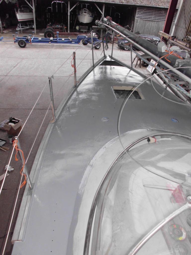 Eine Woche später beginnen wir damit, die unzähligen Löcher zuzuschweißen. Danach wird das Deck geschliffen und lackiert. Der Flugzeugträgerfarbton ist vielleicht gewöhnungsbedürftig, dafür aber ungemein praktisch.