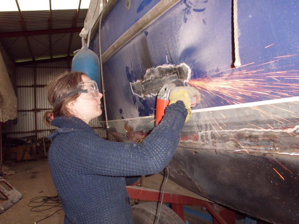 Auch am Rumpf geht es voran: Gemeinsam mit den Fachleuten vor Ort entscheiden wir, die rostigen Stahlplatten auf der Steuerbordseite großflächig auszutauschen. Dafür muss erst mal der alte Stahl herausgeschnitten werden. Mit der Flex gehen wir ans Werk. Zuerst ist es ein komisches Gefühl, doch mit der Zeit verliert man alle Hemmungen und flext Löcher in seinen Rumpf, dass es eine wahre Freude ist.