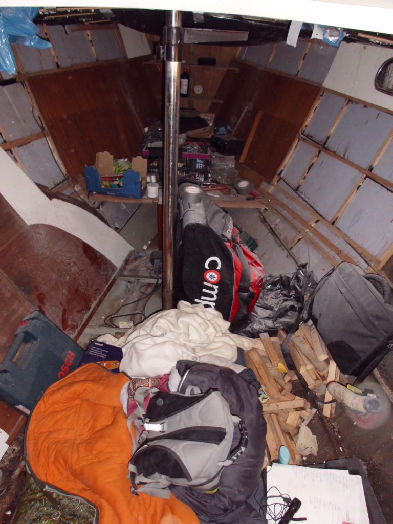 Ich beginne damit, das Schiff komplett zu entkernen. Unzählige Male klettere ich dabei die Leiter rauf und runter, beladen mit allen möglichen, teilweise schweren und unhandlichen Dingen.