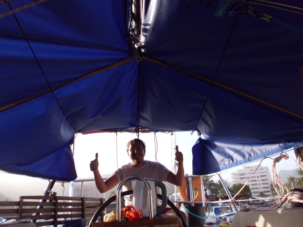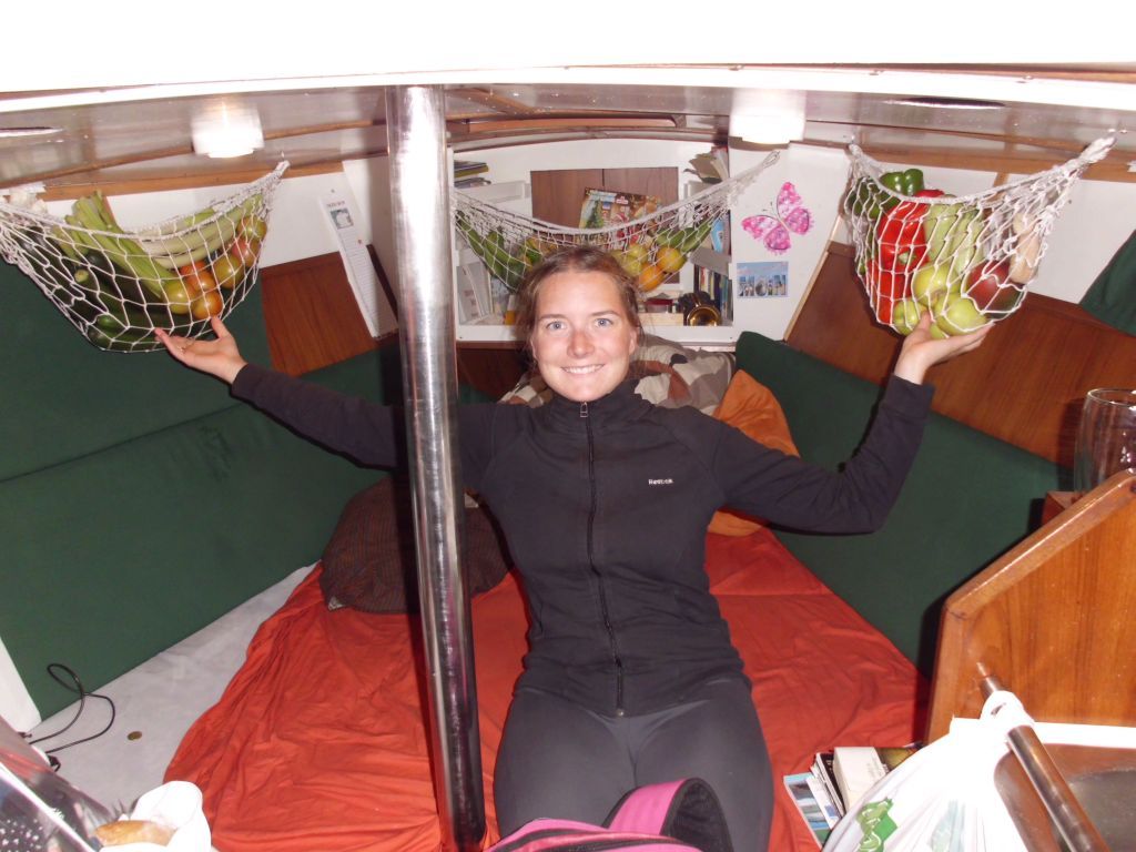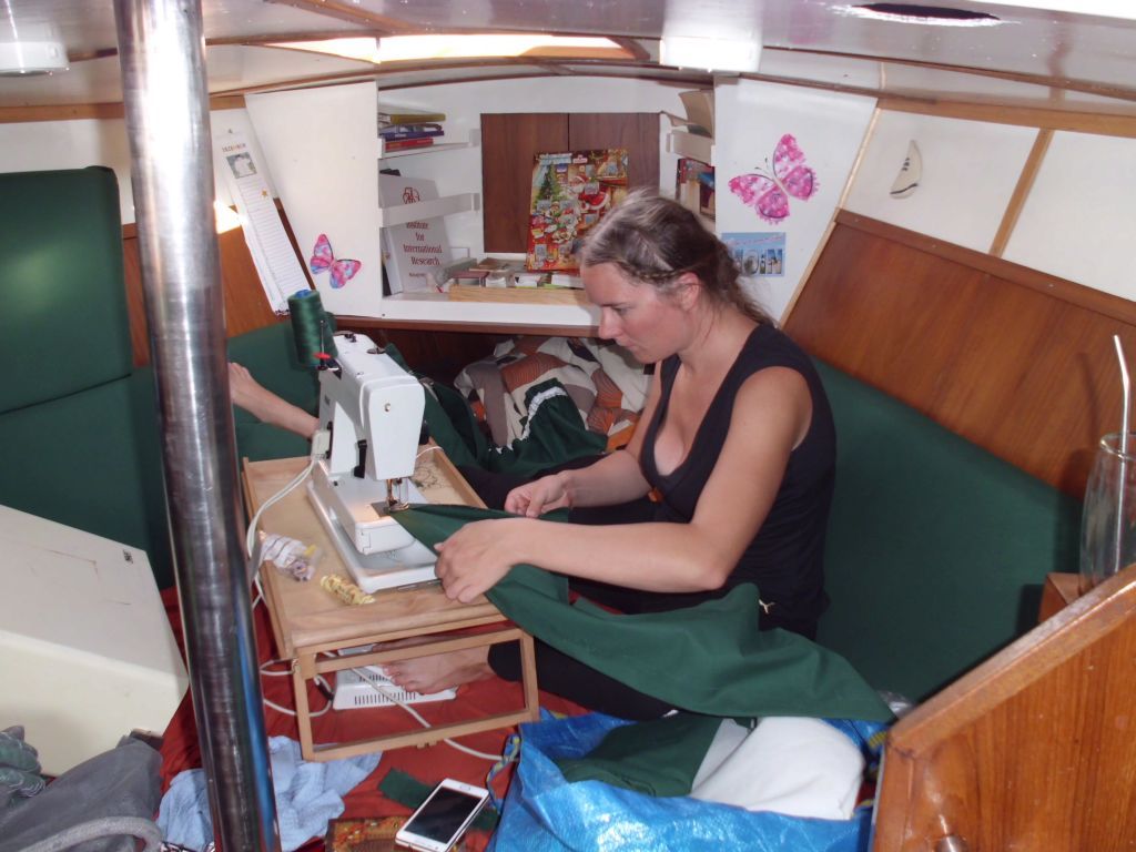 Schon nach nur drei Tagen müssen die zwei in aller Früh wieder aufbrechen und ich bringe sie nach vor zur Fähre. Jaqueline und ich stürzen uns sofort in Arbeit: Vorhänge werden genäht, Netze gebastelt und eine Sonnen/Regenplane für das Cockpit angepasst. Außerdem shoppen wir reichlich Lebensmittel und bringen die Einkäufe stilecht per Dinghy zur SAILOR MOON.