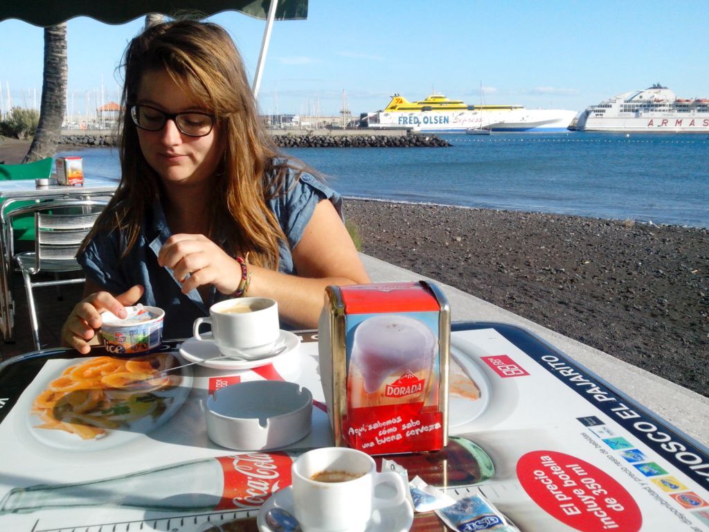 Mit Riesenschritten geht usnere Zeit auf den Kanarischen Inseln dem Ende zu: Morgen schon wollen wir aufbrechen und die 800 Meilen auf die Kap Verden in Angriff nehmen. Aber zuvor genießen wir noch die letzten Tage in Europa, gemeinsam mit unseren Gästen Schmalzi und Resa. Schon am ersten Tag zeigen wir ihnen unsere Lieblingspizzeria, wo wir erst essen und dann den gleichen köstlich aussehenden Cocktail wie die Leute am Nachbartisch bestellen. Die Kellnerin erklärt uns auch sofort die Zubereitung: “Vino y 7up”. Das Ergebnis nennt sich Tinto de Verano und schmeckt erstaunlich gut. Nicht nur deswegen sind wir bis 4 Uhr Früh unterwegs und hinterlassen einen so bleibenden Eindruck, dass uns einer der Barkeeper noch am übernächsten Tag auf der Straße anspricht.