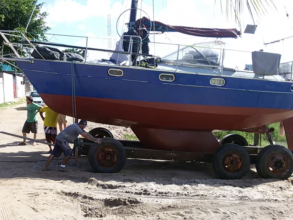 Nach ein paar Tagen sind die beiden aber bestens erholt und auch schon halbwegs an das tropische Klima gewöhnt, und nur zu gern zeige ich ihnen unsere Lieblings-Saftbar in Joao Pessoa, den Kofferraum-Nussverkäufer in Intermares, natürlich den Saxophonspieler mit seiner allabendlichen Bolero-Action und alle anderen Orte hier in der Gegend, die uns bei unserem ersten Aufenthalt ans Herz gewachsen sind. Die SAILOR MOON kommt natürlich auch nicht zu kurz, wir schließen die Funkgeräte an, räumen innen auf, schlagen die Segel an, reinigen den Wassertank, und und und. Als Brian ankündigt, einen neuen Trailer bauen zu wollen, sehen wir unseren Zeitplan schon auf den Kopf gestellt, aber nach zwei Tagen ist alles fertig, ein Kran hebt unser Boot auf das neue fahrbare Ding. Resa und Schmalzi pinseln noch 3,6 kg Antifouling drauf, und bei Niedrigwasser wird die SAILOR MOON zu Wasser gelassen. Die Flut kommt, aber das Boot will und will nicht aufschwimmen, der Trailer muss weiter in den Fluss. Brian versucht es zunächst erfolglos mit seinem Jeep, dann ruft er einen Bekannten an, der auch kurz darauf mit seinem Traktor um die Ecke biegt. Paolo, der Traktorfahrer, hat augenscheinlich nicht mehr mit einem Einsatz an diesem Abend gerechnet und sich ein paar Drinks genehmigt, trotzdem kann er den Trailer mit dem Boot am Traktor befestigen und schafft es, das Boot ein bisschen weiter in den Schlamm zu schieben – die Anhängerkupplung des Traktors bleibt zum Glück das einzige Opfer dieser Aktion. Geschafft denken wir, lösen die Leinen und starten den Motor. Die SAILOR MOON will aber noch nicht ins Wasser, trotz unterschiedlichster Leinenaction bekommen wir den Kiel nicht über die Hinterkante des Trailers drüber. Das Wasser beginnt wieder abzulaufen, und wir richten uns auf eine Nacht auf dem Trailer ein. Mit unangenehmer, aber zum Glück unbedenklicher Schräglage vergehen die nächsten 12 Stunden, bis Brian uns um 5 Uhr früh weckt. Wir probieren es nochmal, und tatsächlich, das Boot kommt frei und wir können im Fluss ankern. Vermutlich hat die SAILOR MOON durch ihr Gewicht den Trailer über Nacht tief genug in den Schlamm gedrückt.