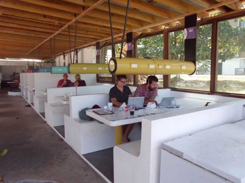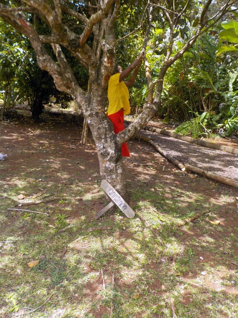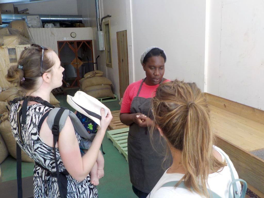 Nach einer kurzen Eingewöhnungsphase kommen wir mit diesen System sehr gut zurecht, man kann für kleines Geld fast überall hinkommen, die Fahrt ist immer ein Erlebnis, und wir wundern uns oft, dass wir die einzigen Segler zu sein scheinen, die die Busse nutzen. Willi ist jedenfalls begeistert, je lauter die aktuellen Hip-Hop-Reggae-Jams auf Spitfire FM laufen, je voller und stickiger der Bus ist und je länger wir darin sitzen, desto besser schläft er. Diese ungewöhnliche Fähigkeit erlaubt uns, auch weiter entfernte Orte auf der Insel besuchen, zwei Stunden im Bus sind kein Problem. Dank Willi’s blauen Augen ist es ungewöhnlich leicht, mit Einheimischen oder anderen Seglern ins Gespräch zu kommen, und so bekommen wir viele Tips, was wir auf Grenada noch so unternehmen können. Durch andere Segler kommen wir auf die Jouvay Chocolate Factory, eine Initiative, die eine alte Zuckerrohrplantage in eine Schokoladenfabrik umgebaut hat und die zu 70% den Bauern von Grenada gehört. Vom Anbau der Kakaobohnen bis zur fertigen Schokoladentafel kann man hier alles live und in Action ansehen. Aufgrund seiner Körpergröße ist Schmalzi perfekt für die Kakaoernte geeignet, und folgerichtig darf er eine reife Frucht pflücken und knacken. Die Mitarbeiterin Rita zeigt uns die reifen Bohnen im Inneren, die von einer weißen, essbaren Schicht überzogen sind. Man kann die Bohne in den Mund nehmen, lutscht drauf herum und spuckt sie dann wieder aus. Mir schmeckt das nicht so wirklich, aber Jaqueline und Resa wollen von da an immer und überall Kakaofrüchte pflücken. Außerdem sehen wir, wie die Bohnen getrocknet, gemahlen und verarbeitet werden. Nachher verbringen wir noch eine Stunde an der Bar, probieren alle Chocolate Smoothies durch und kosten fleißig die unterschiedlichen Schokoladensorten.