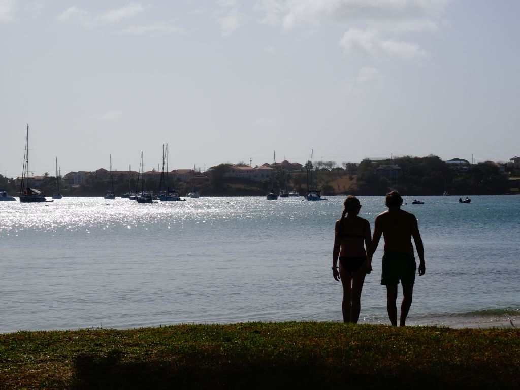 Natürlich kommt aber auch der Strandurlaub nicht zu kurz, mehrmals packen wir die Badesachen ein und fahren die kurze Strecke zur anderen Inselseite, wo es wirklich traumhaft schöne Strände gibt. Willi liegt stundenlang friedlich auf seiner Decke, dazwischen nehmen wir ihn auch erstmals mit ins Salzwasser, was ihm augenscheinlich Spaß macht. Bei den Preisen hier lohnt es sich kaum, selbst zu kochen, wir holen uns oft einfach Essen von einem der vielen Stände am Straßenrand und lassen es uns mit Burgern und Rotis gut gehen. An Schmalzi und Resa’s vorletztem Urlaubstag besuchen wir noch einen der zahlreichen Gewürzgärten, wo wir Zimtrinde direkt vom Baum kosten und viele anderen Gewürze erstmals “live” in der Natur sehen können. Dann ist unsere gemeinsame Woche zu fünft auf der SAILOR MOON auch schon wieder um, und Resa und Schmalzi beginnen, ihre Sachen zusammenzusuchen. Wir hatten wirklich sechs super Wochen, meistens sehr relaxed, manchmal ein bisschen anstrengend, aber immer lustig. In der letzten Woche auf Grenada waren die beiden dann noch eine super Hilfe für uns, Wasser holen, Müll wegführen und viele andere Bootsaufgaben wären für uns drei alleine sicher viel schwerer zu erledigen gewesen, vom Paddeln mit dem Beiboot ganz zu schweigen…