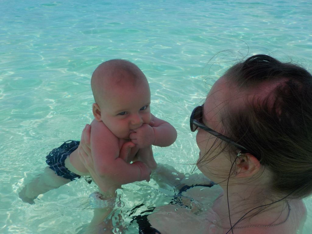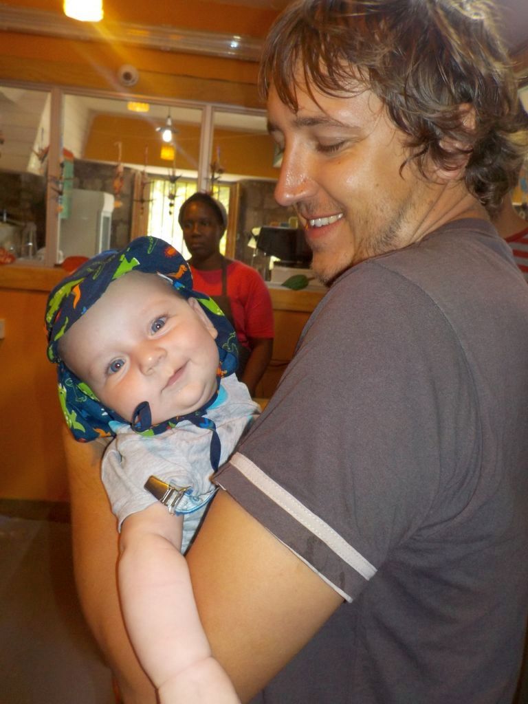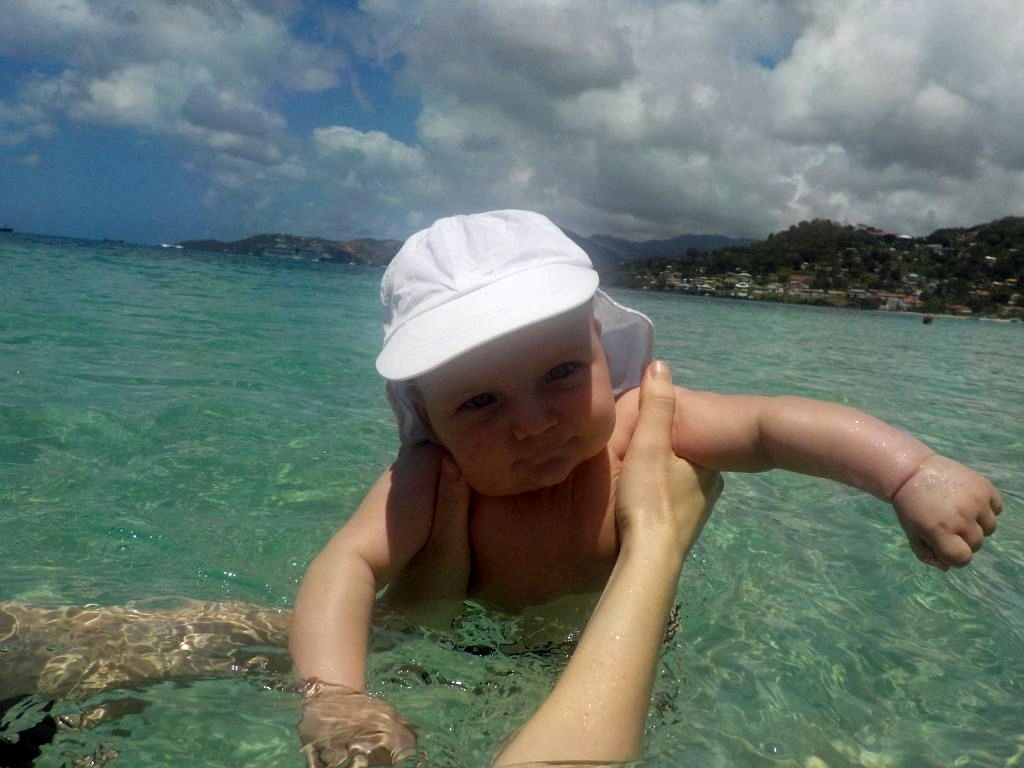 Willi kämpft nur während der ersten Nacht mit dem Jetlag, ab drei Uhr Früh ist er (und natürlich auch seine Eltern) putzmunter, aber danach gewöhnt er sich schnell an den entspannten Insel-Alltag. Wir gehen meist kurz nach Sonnenuntergang so um sieben Uhr abends schlafen, und Willi schläft dann, von ein paar Trinkpausen abgesehen, bis etwa sechs Uhr Früh. Tagsüber will Willi vor allem eines tun: Busfahren! Um das zu verstehen, braucht man ein paar Informationen über das Bussystem in Grenada: Die “Busse” sind eigentlich Minivans, in die je nach Bauart zwischen 16 und 19 Fahrgäste reinpassen, notfalls auch auf einem Polster zwischen zwei Sitzen hockend. Die meisten werden privat betrieben, von einem Fahrer und seinem meist jugendlichen Kompagnon, dessen Aufgabe es ist, die Schiebetür auf- und zuzumachen und das Geld zu kassieren. Abgesehen von einem kleinen Aufkleber, der die Liniennummer zeigt, unterscheiden sich die Fahrzeuge optisch ebenso stark voneinander wie der Musikgeschmack der Fahrer, die Qualität der Soundanlage oder der Erhaltungszustand. Obligatorisch ist anscheinend nur ein Name auf der Windschutzscheibe, die Busse heißen hier Too much ah dem, My enemy is not necessary oder Humble they self. Es gibt Ultra-Pimpmobile mit getönten Scheiben, Alufelgen und Subwoofern, unauffällige alte Mitsubishi-Minivans mit Tapetenverkleidung im Innenraum, und letztens waren wir sogar mit einem Gospel-Fan unterwegs, sein Bus dekoriert mit christlichen Aufklebern… tagelang hatten wir noch “Gimme Jesus in the Mornin'” in den Ohren. Aufgrund der Musik beschränkt sich die Konversation im Inneren meist auf ein Minimum, vor allem die Türöffner/Kassierer sind Meister darin, sich mit lässigen Gesten und für uns unverständlichen Lauten auszudrücken. Will man einsteigen, braucht man eigentlich nur irgendwo an der Straße entlangzugehen, die Fahrer sind eifrig dabei, durch Winken oder Rufen neue Fahrgäste aufzugabeln. Auch wenn man kein Wort versteht, es bedeutet immer “willst du mitfahren”. Der Bus mag noch so voll aussehen, wenn er stehen bleibt, ist noch genug Platz. Busstationen gibt es zwar, aber wenn nicht gerade ein Polizeiauto danebensteht, kann man einsteigen, wo man will. Auch in Bezug auf die Route sind die Fahrer offen für Vorschläge, wenn alle Fahrgäste einverstanden sind, kann es da durchaus kurzfristige Änderungen oder Umwege von einer halben Stunde geben – man hat es nicht eilig in Grenada.