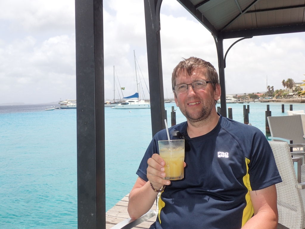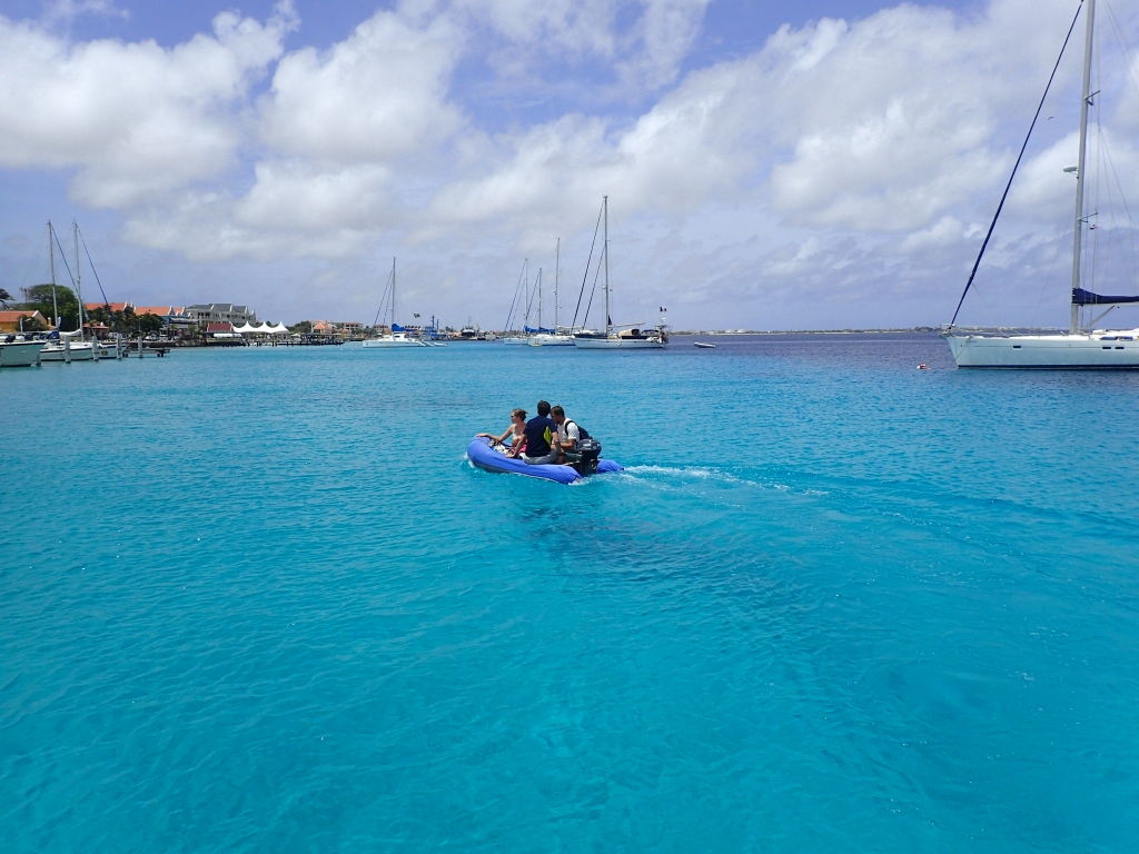 Ich überzeuge Jaqueline, dass es unbedingt nötig ist, die beiden mit der SAILOR MOON vom Flughafen abzuholen, und schlage all die netten Angebote von anderen Seglern aus, die uns ihre Dinghys oder sogar Autos zur Verfügung gestellt hätten. Wir stehen um sechs Uhr früh auf, lösen die Leinen und motoren die paar Meilen Richtung Flughafen, wo wir unser Boot an einer der Nationalpark-Tauchbojen befestigen. Dann verfrachte ich Willi in unser Beiboot und wir motoren an Land, Jaqueline muss, den Park-Regeln entsprechend, das Boot bewachen. Der InselAir-Flug von Curacao hat bei 15 Minuten Flugzeit nur 25 Minuten Verspätung, und kurz danach schnorcheln unsere Gäste auch schon zum ersten Mal im karibischen Meer. Wir haben dazu noch Glück, einen Schnorchel-Spot mit so vielen verschiedenen Fischen (Maria: “man glaubt, man schwimmt in einem Aquarium im Haus des Meeres”) haben selbst Jaqueline und ich noch nicht gesehen. Bevor es zu heiß wird, machen wir uns aber wieder auf den Rückweg zu unserer Stamm-Boje vor Karel’s Bar.