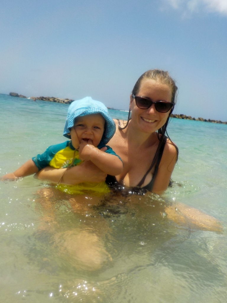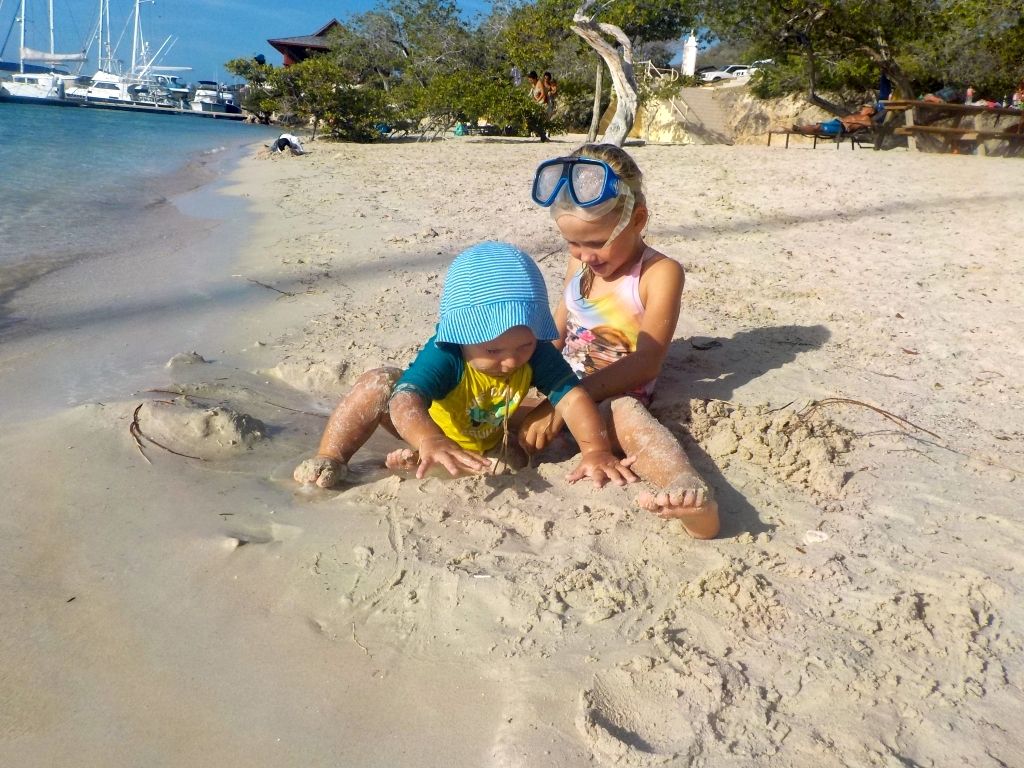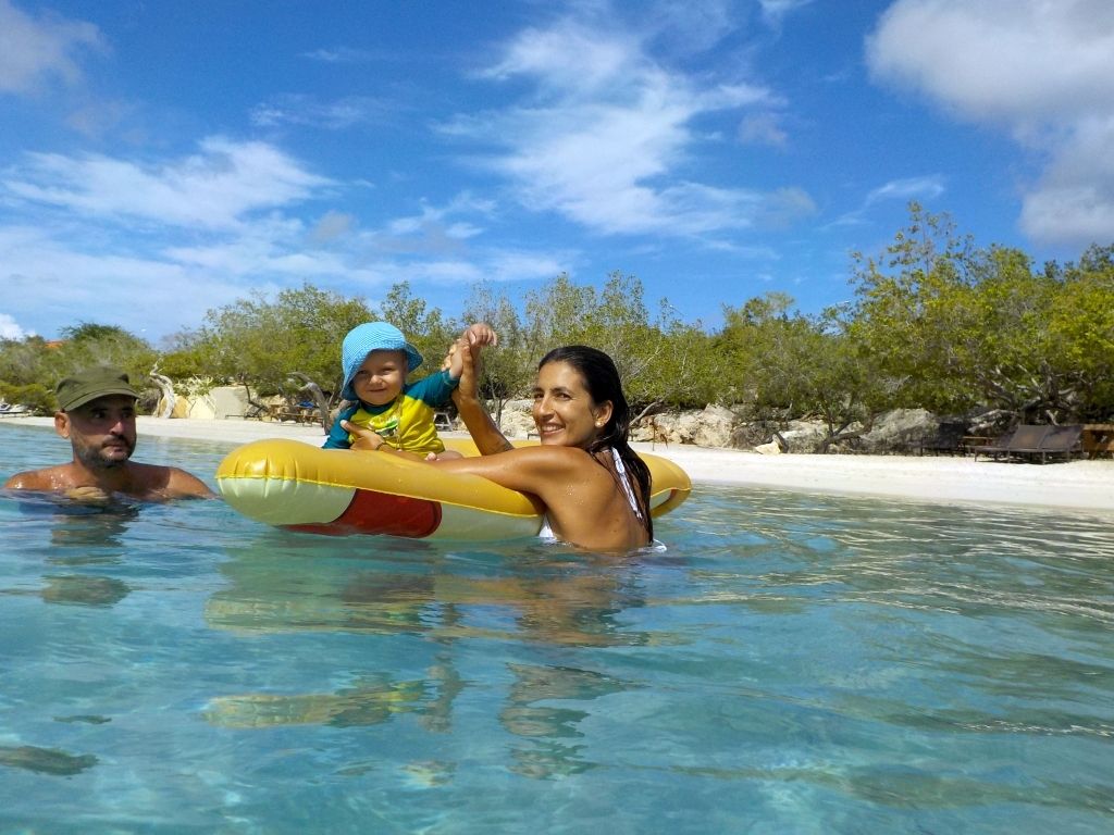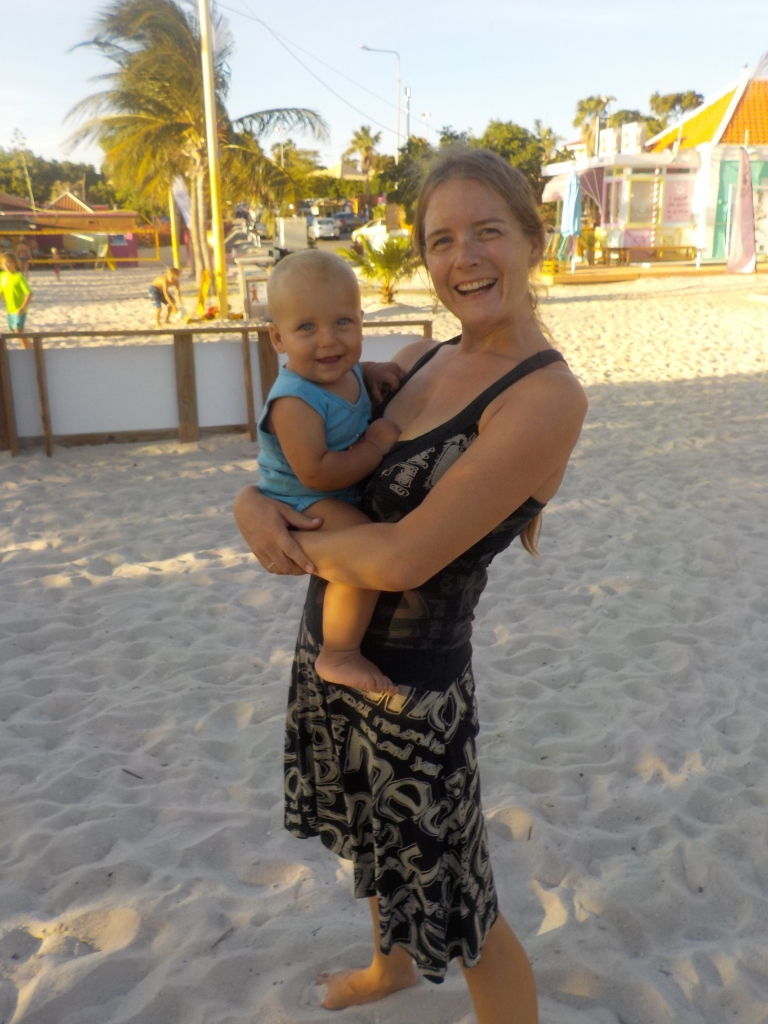 An den Fotos sieht man deutlich, was wir momentan am häufigsten tun: Relaxen am Strand! Kaum ein Tag vergeht, an dem Willi nicht zumindest ein, zwei Stunden irgendwo im Sand herumkrabbelt oder im seichten Wasser badet. Am Boot gäbe es zwar einiges zu tun, aber die letzten Wochen waren wir wiedermal eher faul. Willemstad kennen wir mittlerweile in- und auswendig, daher verbringen wir viel Zeit auf der SAILOR MOON, auf anderen Booten oder an den Stränden in der Umgebung von Spanish Waters. Viele Fahrtensegler verbringen die Hurrikan-Zeit hier in Spanish Waters, und oft treffen wir uns mit anderen Yachties zum Grillen am Strand oder zum Sundowner an der Bar. Kian von der ESTRELLA beispielsweise ist nur fünf Monate älter als Willi (aber genauso groß). Um richtig miteinander zu spielen sind die beiden zu jung, trotzdem haben wir mit ihnen und Kian’s Eltern Rose und Alco viel Spaß. Auch mit der Crew der DEE sind wir oft unterwegs. Nae stammt ursprünglich aus Thailand, ihr Mann Joao aus Portugal. Die beiden haben sich in Macao kennengelernt, geheiratet und sind nach der Geburt ihrer Tochter Maria auf ein Segelboot in der Karibik gezogen. Die drei müssen ihre Reise aus gesundheitlichen Gründen momentan unterbrechen, wir konnten sie mit unseren selbstgemachten Käsespätzle hoffentlich zumindest ein bisschen trösten. Außerdem lernen wir den Belgier Bob kennen, auf dessen Boot PAUWKE Jaqueline zum ersten Mal in ihrem Leben Shrimps essen darf, die ihr nicht zu zäh sind, und haben viel Spaß mit den Portugiesen Cat und Jorge und ihren drei Kindern von der CARACOL.