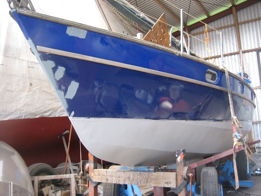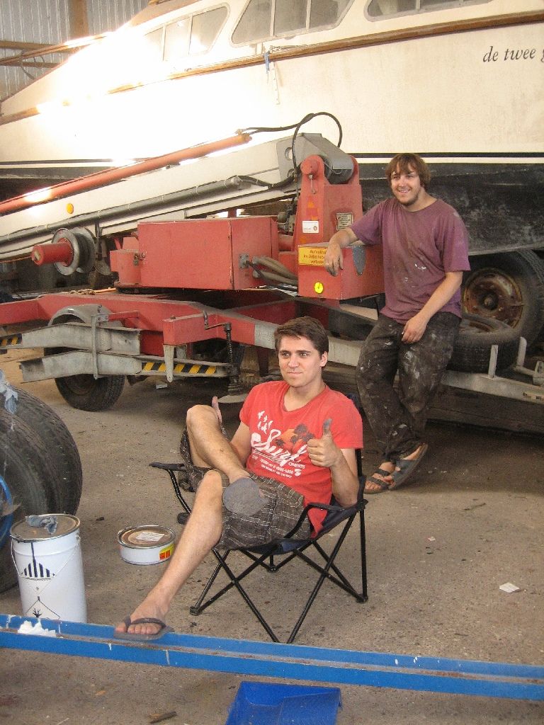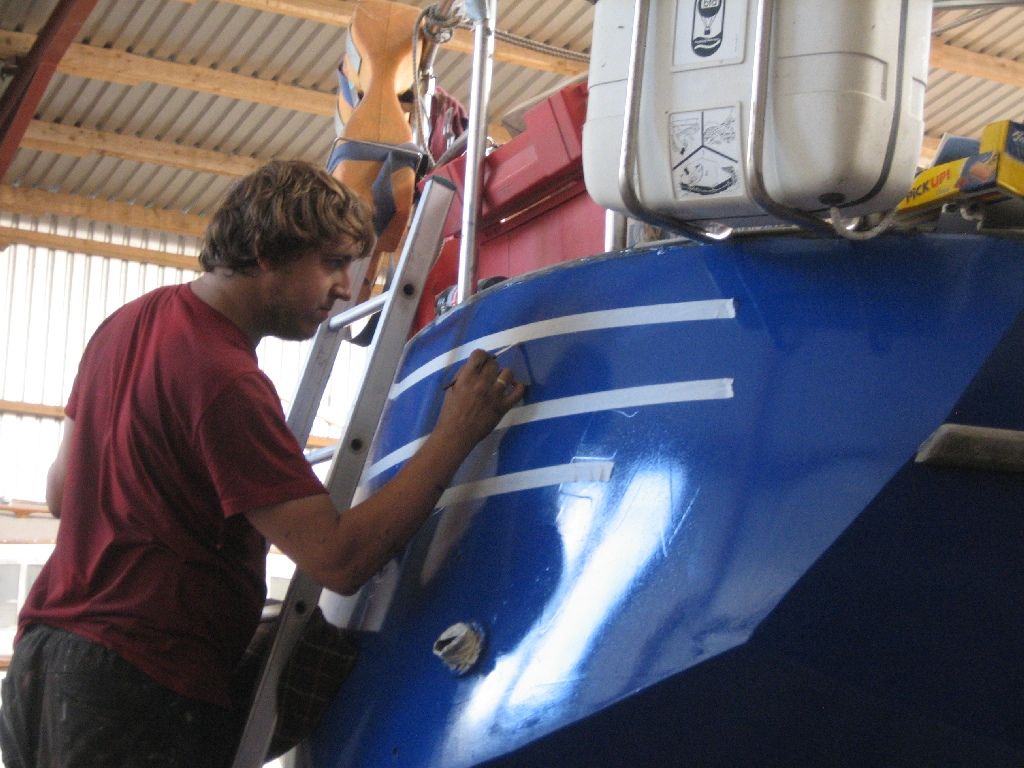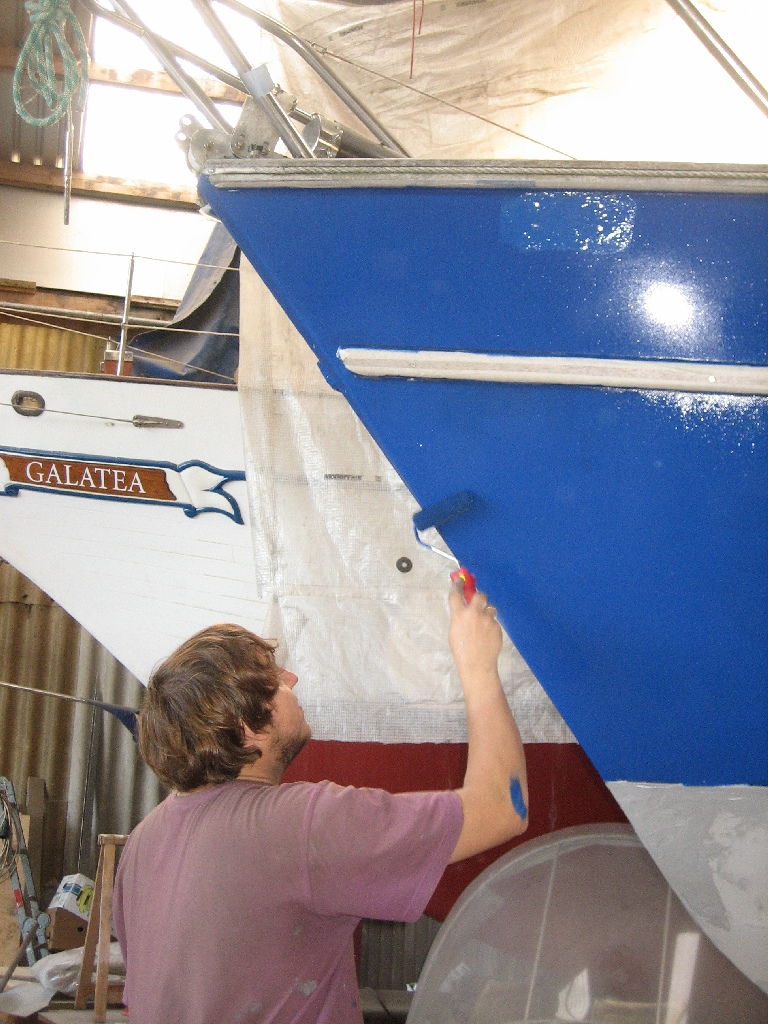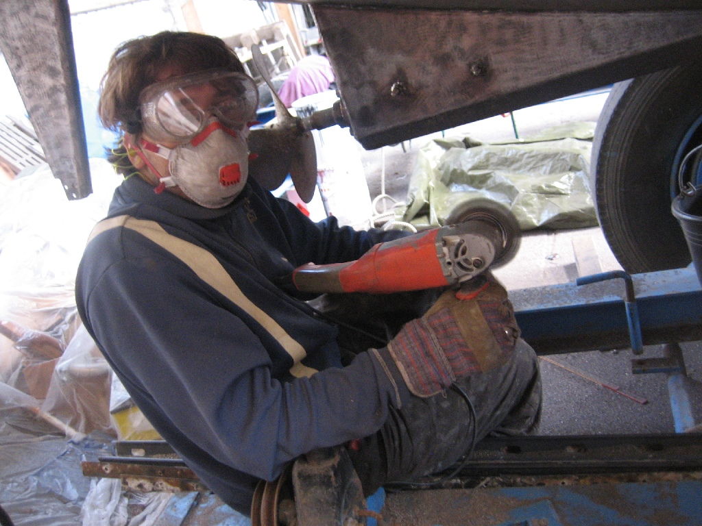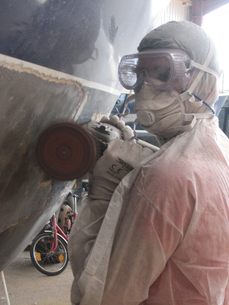 Nach drei Tagen kommen mein Vater und mein Bruder Matti per Flugzeug aus Wien, und gemeinsam rücken wir dem Rumpf mit verschiedensten Schleifgeräten zu Leibe. Der alte Lack staubt fürchterlich, die Schleifpositionen sind nicht immer angenehm und selbst unser kleines 30-Fuß-Boot wirkt in diesem Zusammenhang wie ein Ozeandampfer. Jeden Abend nutzen wir die 15-Minuten-Hafendusche voll aus und säubern zuerst uns und dann die Duschkabine. Drei Tage später kennen wir jeden Quadratzentimeter des Rumpfes, dafür ist jetzt überall der blanke Stahl zu sehen. Mit mehreren Schichten Industriefarbe grundieren wir danach das Unterwasserschiff (und unser Gewand), bauen dann das Ruder wieder ein und bringen noch zwei Schichten Antifouling auf.