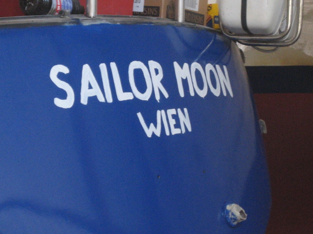 Die restlichen Tage verbringen wir damit, ein paar Innenarbeiten zu erledigen, die Elektrik zu planen, das Deck wieder dicht und Sikaflex von unseren Fingern zu bekommen. Dann sind meine beiden Helfer wieder auf dem Weg zum Flughafen, und ich bereite inzwischen alles fürs Kranen und Maststellen vor. Zwei Tage habe ich Zeit, dann kommt mein Bruder Ma samt Freundin nach Varel, um zuerst ein bisschen zu helfen und dann Urlaub zu machen. Ein Liegeplatz beim WSV Varel ist organisiert, der neue Schiffsname SAILOR MOON aufgepinselt, und das Boot wird ins Wasser gekrant. Alles klappt, die neuen Rumpfdurchlässe sind auf Anhieb dicht, der Motor springt sofort an und wir motoren durch den Kanal zu unserm neuen Liegeplatz. Gleich danach muss ich auch schon wieder zurück nach Wien, da ich mit Anfang August meine Stelle auf der Uni wieder antreten werde.