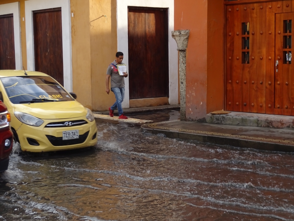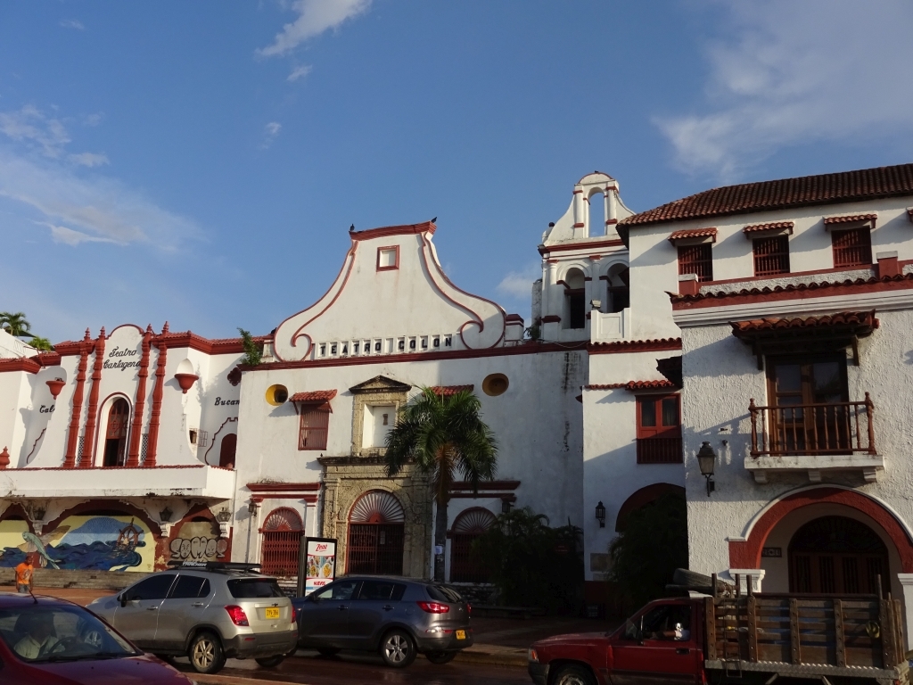 Unser Cartagena-Ausflug beginnt mit ein paar kleineren Schwierigkeiten: Durch irgendeinen Defekt am Bus dauert die Fahrt von Santa Marta nicht vier, sondern sechs Stunden, Wartezeit an einer Tankstelle neben der Straße inklusive. Außerdem wurde die Zimmerreservierung im Hostel storniert, es gab ein Problem mit der Kreditkarte. Nach einigem Diskutieren ist jedoch eine Lösung gefunden, mit der alle leben können, und wir fallen müde ins Bett. Matti hat eine lange, aber problemlose Anreise hinter sich, und eine überteuerte Taxifahrt später kann auch er sich in seinem Extra-Zimmer hinlegen. Die Klimaanlage und die im Vergleich zu Santa Marta entspannte Moskitosituation lassen uns wunderbar schlafen, und am nächsten Tag brechen wir ausgeruht zum ersten Stadtrundgang auf.