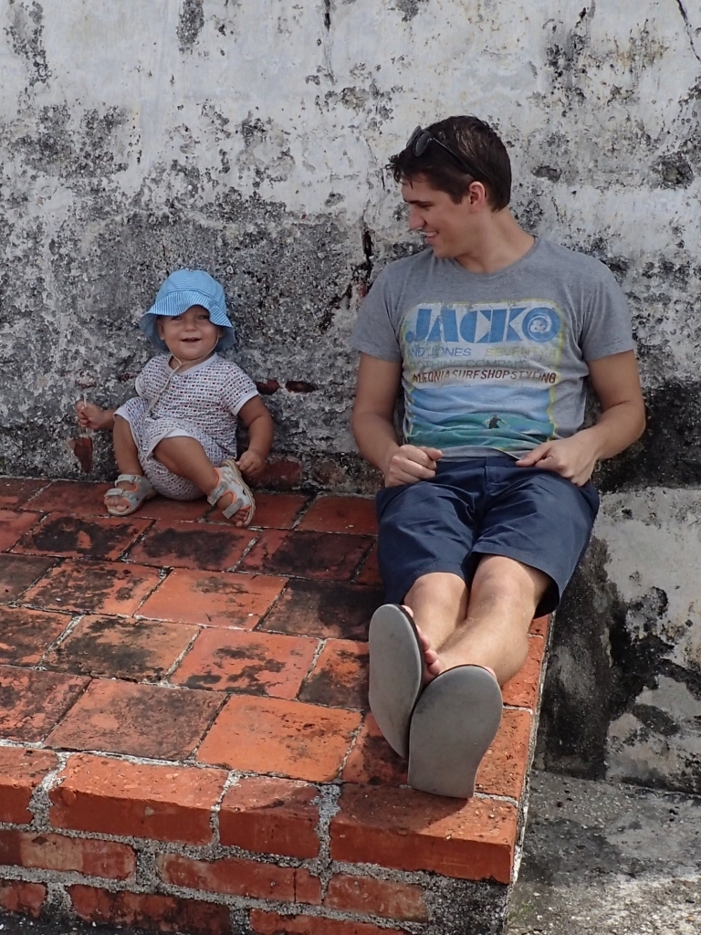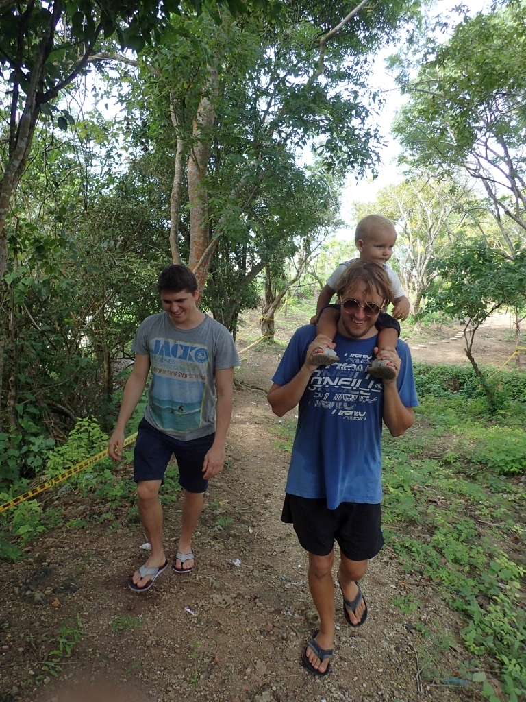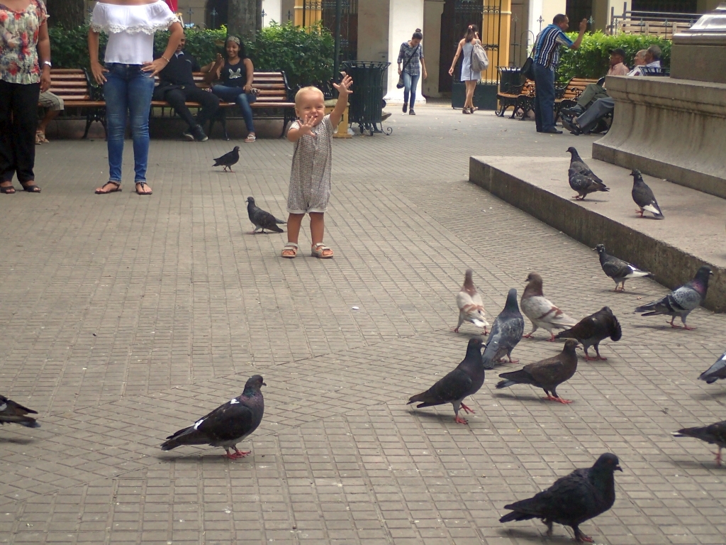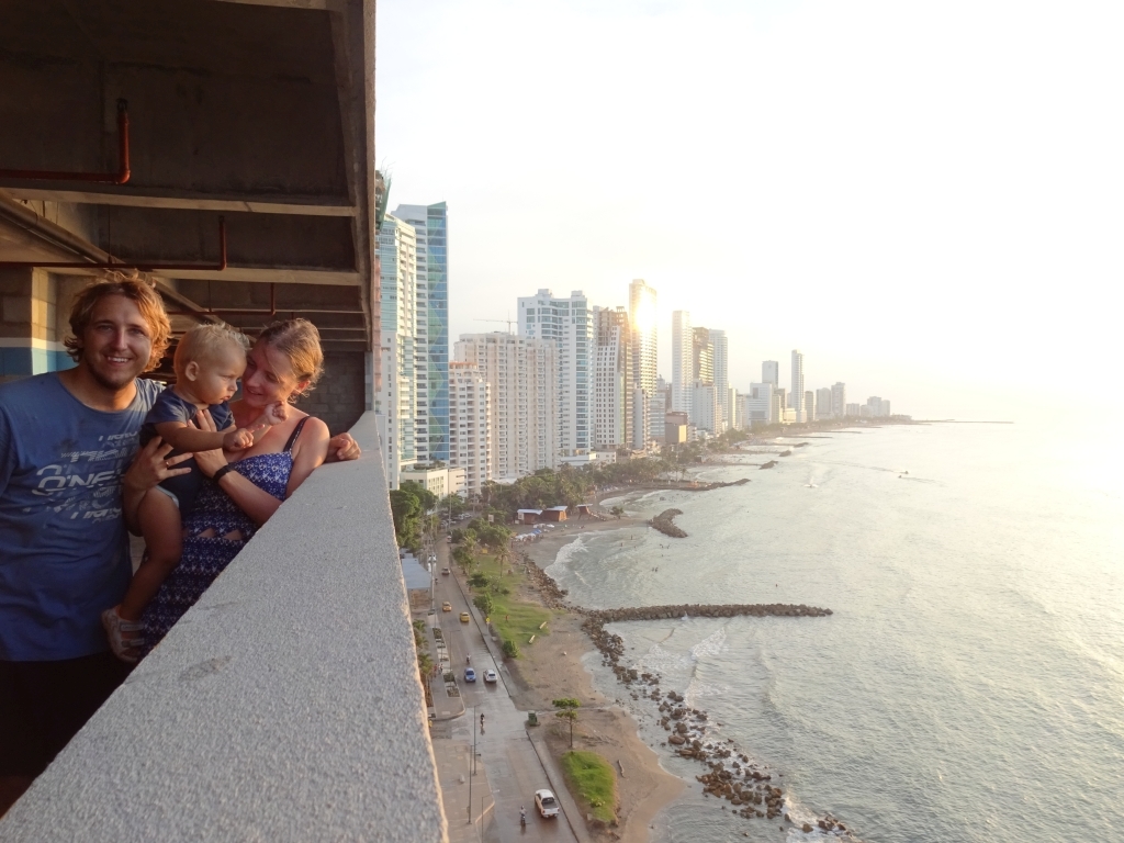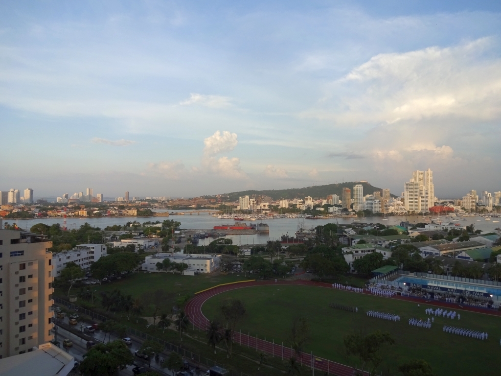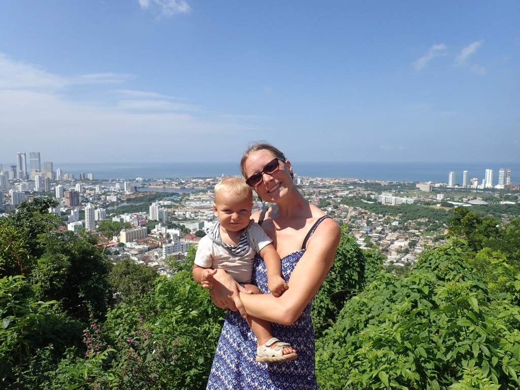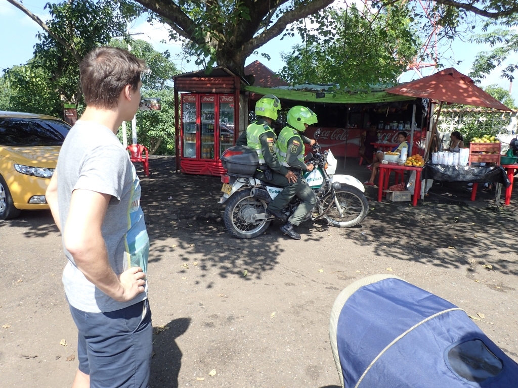 Ein wenig außerhalb der Stadt gibt es einen kleinen Hügel, von dem man eine gute Aussicht auf die Stadt haben soll. Kurz entschlossen machen wir uns auf den Weg, werden jedoch schon auf den ersten Metern von einer alten Frau aufgehalten, die uns zum nächsten Polizei-Straßenposten schickt. Etwas perplex lassen wir uns von den Polizisten erklären, dass es entlang des Weges zum Gipfel schon mal zu Überfällen komme. Gangster würden sich im Gebüsch verstecken und den überraschten Fußgänger von hinten anspringen. Die meisten Touristen würden deshalb mit dem Taxi hinauffahren. Falls wir aber trotzdem zu Fuß gehen wollten, sei das kein Problem, er würde uns einfach eine Polizeieskorte auf den Weg mitgeben. Wir willigen natürlich ein, sowas lassen wir uns nicht entgehen. Tatsächlich werden zwei Motorradpolizisten abgestellt, die uns – jeweils von Schattenplatz zu Schattenplatz fahrend – die steile Serpentinenstraße hinauf zum Aussichtspunkt begleiten. Die Beamten erledigen ihren Job routiniert und professionell, man könnte fast meinen, sie eskortieren jeden Tag dutzende ausländische Touristen samt Baby im Kinderwagen hier hinauf. Erst oben angekommen lassen sie durchblicken, dass dieser Auftrag eher eine Ausnahme darstellt, und verabschieden sich mit einem Lächeln. Danke an dieser Stelle nochmal an die kolumbianische Policia Nacional und ihre pragmatischen Problemlösungsansätze, wir haben uns selten so sicher gefühlt 🙂