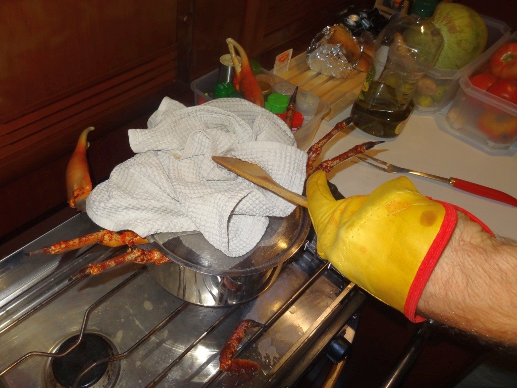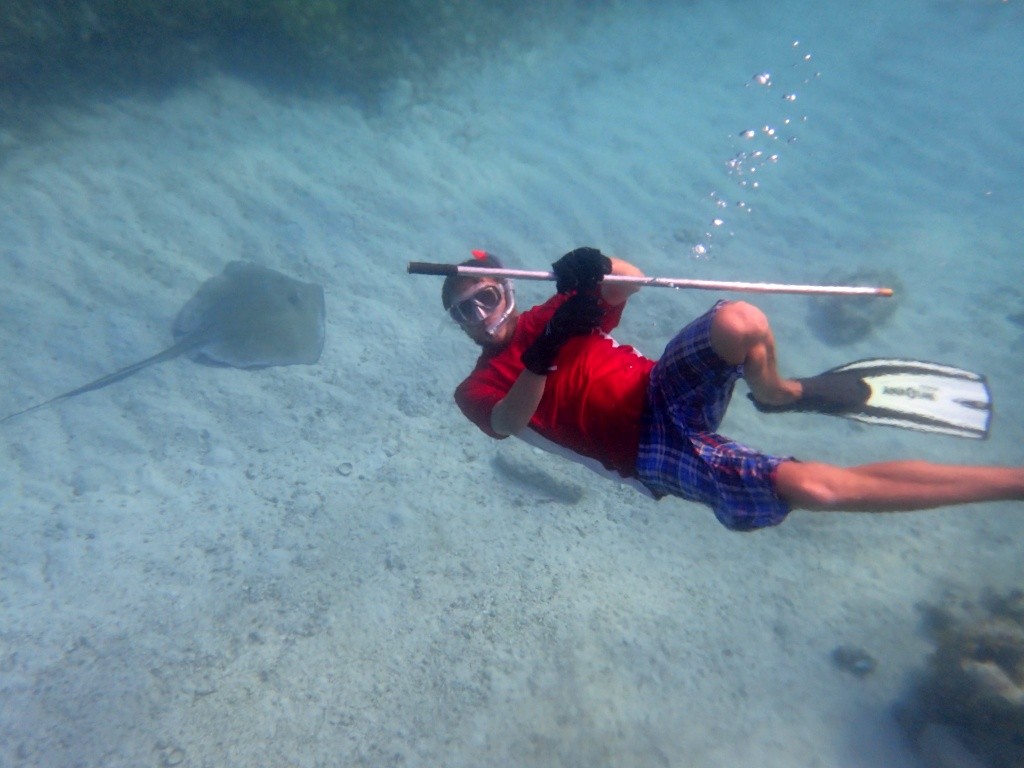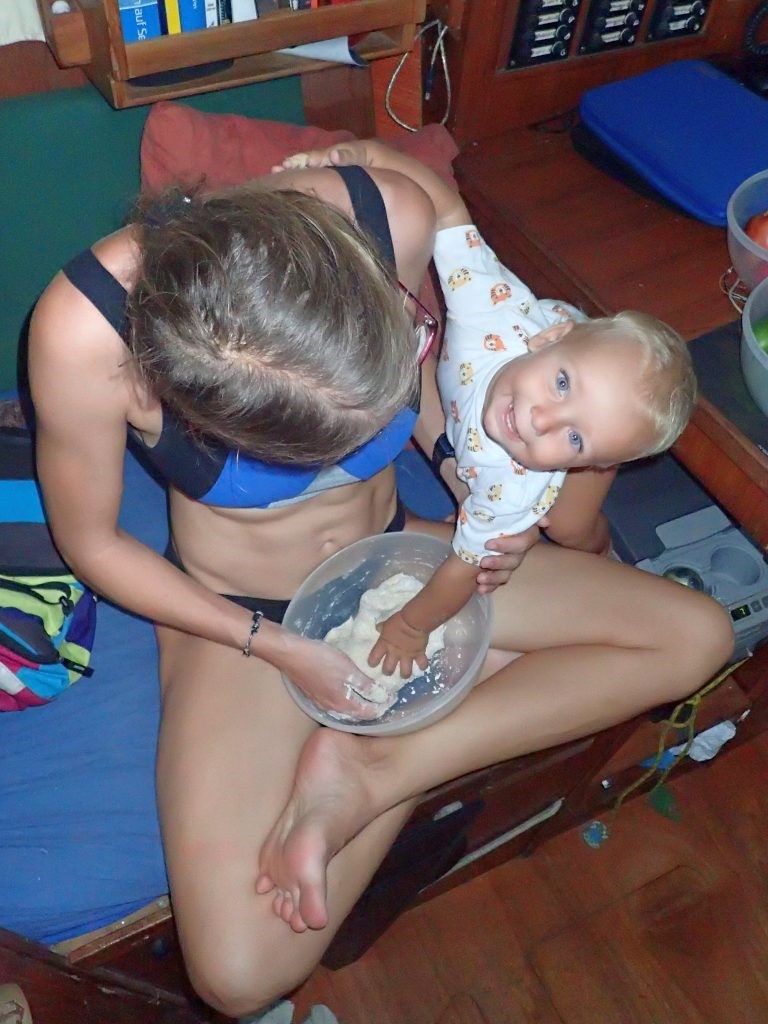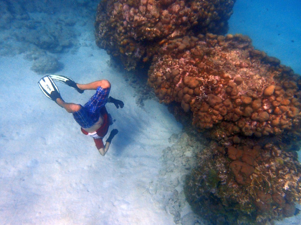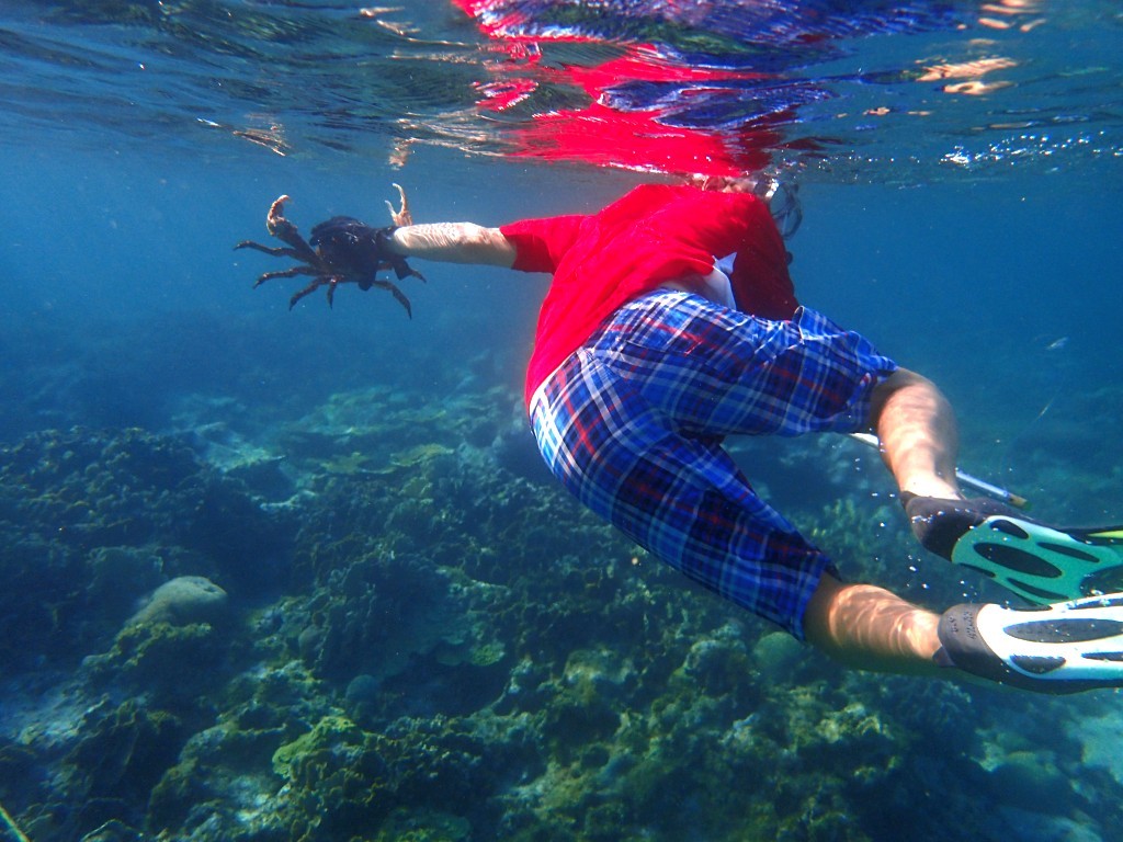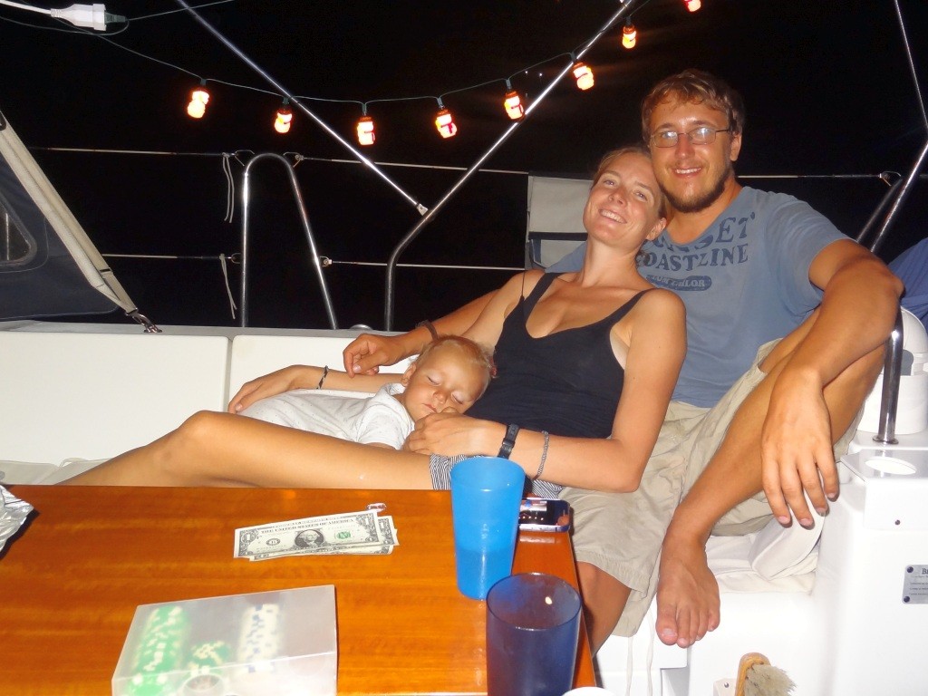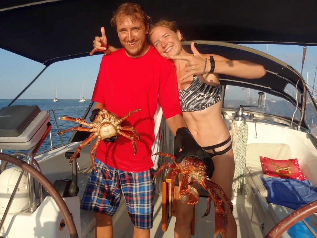 Ein paar Tage später kommt die PANDORA in Chichime an, das bedeutet vor allem eines: Pokern! Willi fühlt sich mittlerweile schon zu Hause auf Franzis und Pesches Boot, die beiden sind unglaublich hilfsbereit und großzügig (unser Wasserproblem zum Beispiel ist dank ihrem Wassermacher keines mehr), und außerdem lassen sie sich jederzeit zum Babysitten einteilen. Jaqueline und ich können so seit langem mal wieder zu zweit schnorcheln gehen, diesmal jedoch mit einem todernsten Hintergrund: Abendessen! Seit wir von der CARACOL-Crew in die Welt der Krabben und Langusten eingeführt wurden, ist vor allem Jaqueline kaum mehr zu bremsen. Der ungewönhlich schwache Wind ermöglicht uns, an normalerweise aufgrund der Brandung unzugänglichen Stellen zu tauchen, und wirklich, dank Jaquelines Adleraugen kommen wir mit unseren ersten beiden selbst gefangenen Krabben zurück! Unzureichende Topfgrößen können uns nicht davon abhalten, noch am selben Abend ein ausgezeichnetes Essen zuzubereiten. Natürlich wird anschließend zur Abwechslung mal …gepokert!