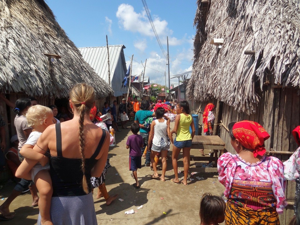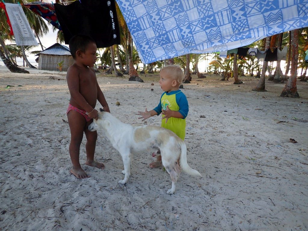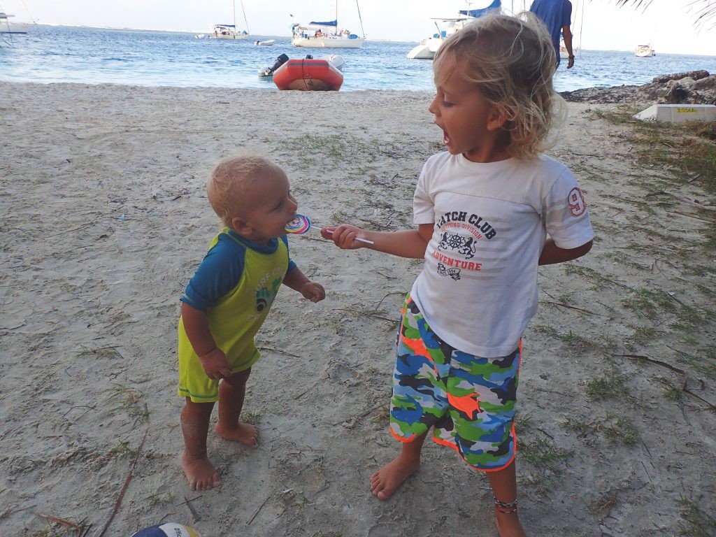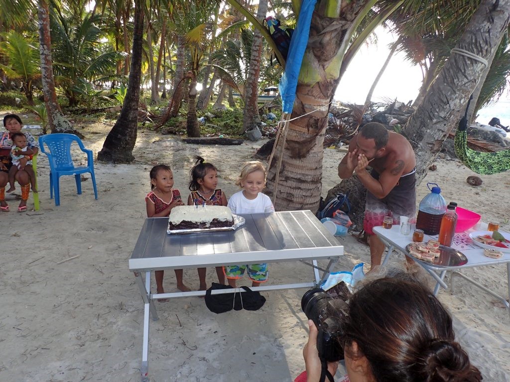Die vier Dörfer selbst platzen aus allen Nähten, man schlängelt sich in engen Gassen zwischen den bis ganz dicht ans Wasser gebauten Hütten durch, keine noch so kleine Fläche bleibt hier ungenutzt. Natürlich fürchten die Bewohner nichts mehr als ein Ansteigen des Meeresspiegels, selbst wenige Zentimeter würden unweigerlich zu großen Problemen führen. Nach unserer Ankunft zwängen sich noch einige Yachten in den kleinen und nicht ganz optimalen Ankerplatz, deshalb bleiben wir nur eine Nacht und motoren mit einem Abstecher in die West Lemmon Cays nach Chichime. Arthur von der PURA VIDA feiert dort seinen vierten Geburtstag, seine Eltern Elaina und Peter haben Willi und uns ebenfalls eingeladen. Es wird eine lustige Party am Strand, Arthurs Kuna-Freunde sind ebenso dabei wie Segler jeden Alters. Elaina hat einen typisch brasilianischen Kuchen gebacken, die meisten Gäste müssen nach einem kleinen Stück und gefühlten 5000 Kalorien aufgeben.