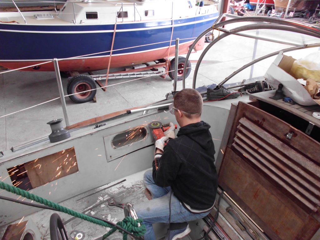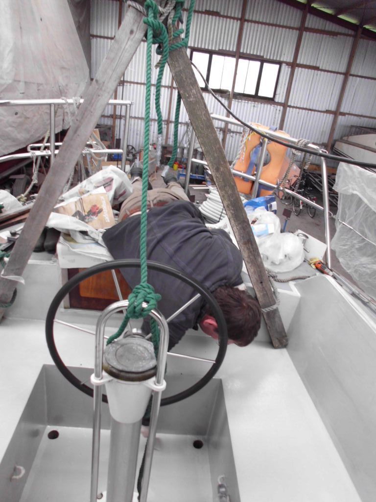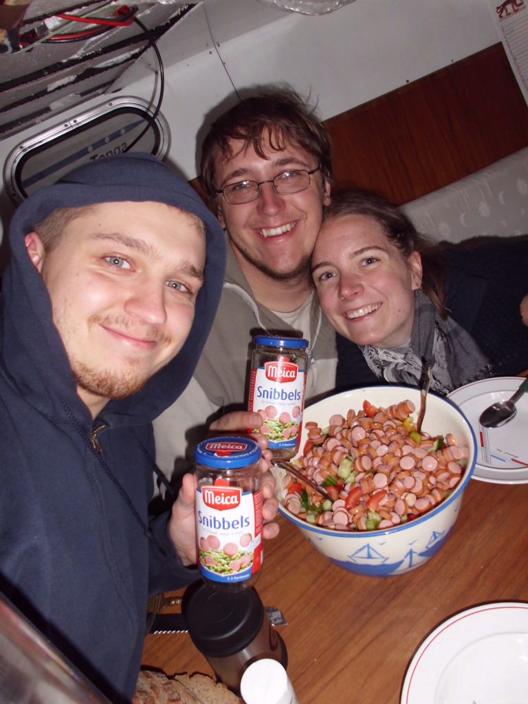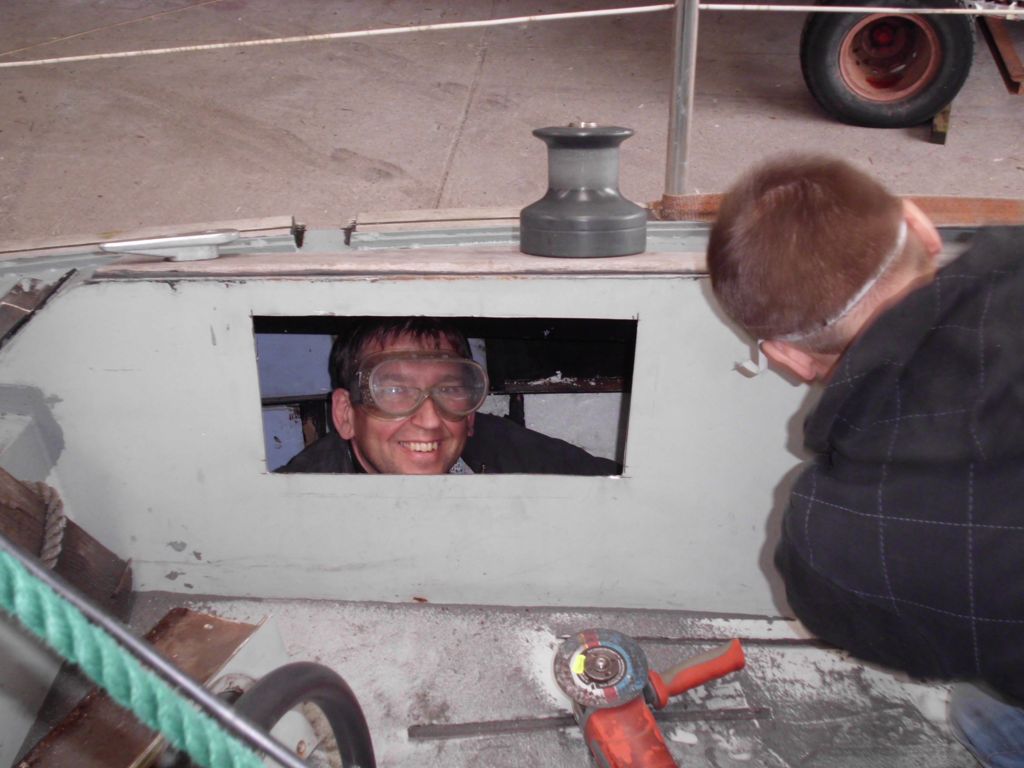 Wolfgang und Ma sind topmotiviert, freuen sich aufs Werkeln und gehen entsprechend an die Arbeit. Ihre Motivation ist ansteckend und tut uns gut, und bei acht statt nur vier Händen geht einfach viel mehr weiter, was das allgemeine Wohlbefinden an Bord deutlich hebt – vor allem Jaqueline hat an manchen Tagen mit unserem derzeitigen Baustellenleben zu kämpfen. Grundsätzlich gehts uns aber noch immer gut, und wir machen große Fortschritte (DANKE an dieser Stelle nochmal an Ma und Wolfgang!). So schneiden wir die durchgerosteten Schwalbennester (Ablageflächen) im Cockpit heraus, schweißen die entstandenen Löcher zu und streichen das Cockpit (inklusive akrobatischer Einlagen und innovativer Lackapplikationstechniken) neu. Außerdem entwerfen und verwirklichen wir die neue Kücheneinrichtung, ziehen neue Kabel durch den Mast, erneuern den Antifoulinganstrich und installieren Kabeldurchführungen an Deck. Außerdem nutzen wir das Auto, kaufen Styroporplatten und bringen die Rettungsinsel zur Inspektion nach Wilhelmshaven. Beim Essen schlagen wir in dieser Woche über die Stränge und genießen Fischbrötchen, Fischbuffets im Brauhaus und Krabben- und Räucheraalsuppen (danke M.Z.!).