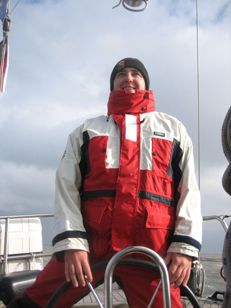 Die so gewonnene Zeit verbringen wir mit Ölwechsel und sonstigen kleinen Arbeiten und hoffen, dass von den Stegnachbarn keiner etwas von unseren nächtlichen Manövern mitbekommen hat. Am nächsten Tag stehen wir extra noch früher auf, und diesmal klappt alles. Im Finstern motoren wir die exzellent befeuerte Weser hinunter, weichen problemlos einigen großen Schiffen aus und passieren Bremerhaven noch im Dunkeln. Da der Fedderwarder Priel nicht mit Leuchtfeuern markiert ist, müssen wir dann etwa eine Stunde aufs Tageslicht warten. Es nieselt und ist noch sehr kalt, also keine sehr angenehme Wartezeit. Als es dämmert, biegen wir in den Fedderwarder Priel ein, hangeln uns von Tonne zu Tonne bis die ersten Pricken der Kaiserbalje in Sicht kommen, die flachste Stelle unserer Route. Es ist noch lange nicht Hochwasser (und nur dann kommt man dort drüber), daher werfen wir den sogenannten Anker (das Ding ist hohl, aus Alu und wiegt vielleicht 1 kg, es ist aber fast windstill und Strom gibt es hier auch keinen, daher muss das reichen) und verziehen uns unter Deck.
