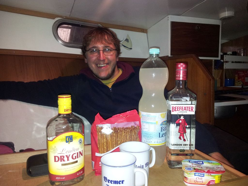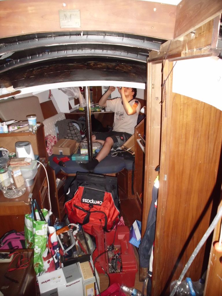 Außer feiern waren wir natürlich auch fleißig, wir haben jetzt Licht auf dem Schiff! Die ersten beiden LED-Leuchten sind montiert, Kabel verlegt und die Verbraucherbatterie ist angeschlossen. Nachdem wir an einem Tag schon drei Glühbirnen für unsere 220V-Klemmlampe ruiniert haben, sind die fix montieren Lampen ein deutlicher Komfortgewinn. Das WC ist so gut wie fertig, die Achterkabine ist gerade am Entstehen, und die Küche ist bereits eingeräumt. Uns gehts nach wie vor gut, die Arbeitsmotivation schwankt zwar ein bisschen, aber wir sind mit dem Aussägen/Lackieren von Möbeln und Wandverkleidungen schon relativ weit, nur mehr die Hundekoje fehlt. Morgen werden wir vermutlich nach Wilhelmshaven radeln, am Wochenende gehts dann wieder weiter.